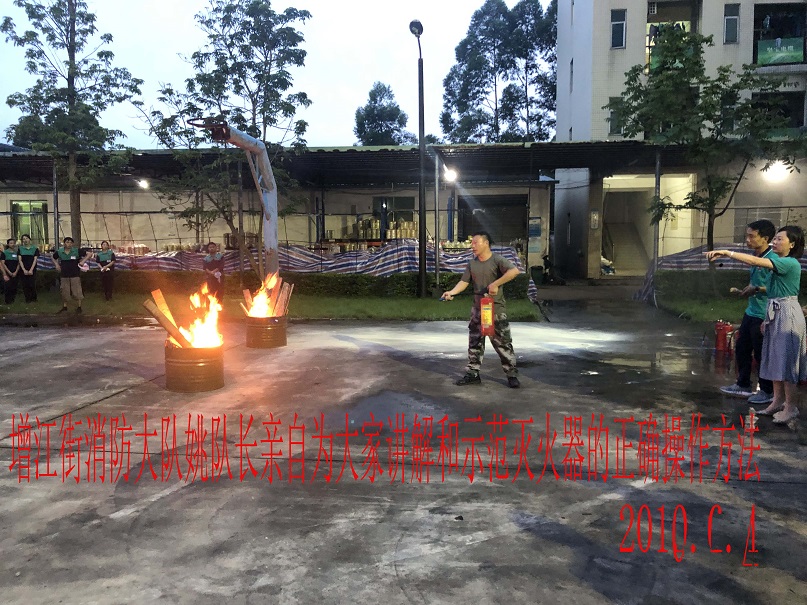 隨後 ,增江街消防大隊隊長姚隊親自對幹粉滅火器及消防水帶的使用方法進行詳細的講解和實操示範,就消防安全基本知識對參與的員工進行普及。