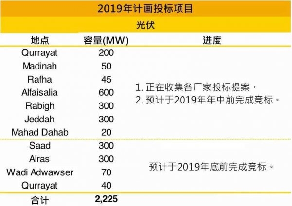 沙特阿拉伯自2017年開始推動再生能源發展,在國家再生能源計劃Vision2030中,製定2030年前光伏將達到40GW的累積安裝量,也使得2018-2029年每年約有3.3GW的市場需求。目前光伏市場以電價競標PPA刺激需求,並計劃在2019年完成共計2.225GW項目的招標,其中的1.551GW預計在2019年上旬完成招標。