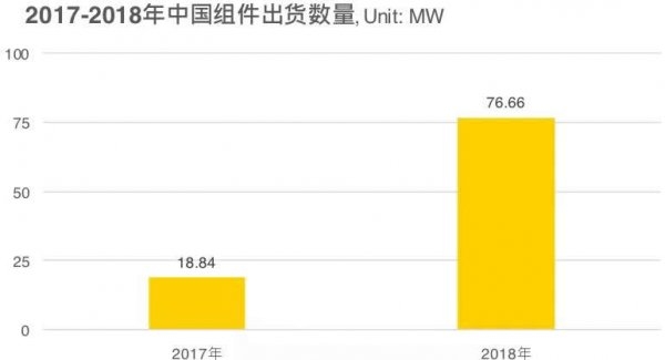 根據PV InfoLink中國海關出口數據庫顯示,2018全年自中國出口至沙特阿拉伯的光伏組件數量為76.66MW,和2017年相比組件出口數量成長三倍之多,2018年出貨組件預計大部分將用於2018年完成競標的300MW大型項目。