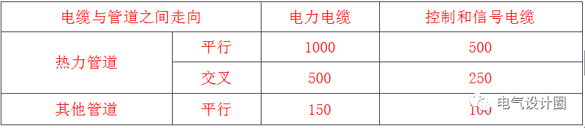 電纜與管道之間無隔板防護時的允許距離(mm8)抑製電氣幹擾強度的弱電回路控製和信號電纜,除應符合本規範第3.6.6條~第3.6.9條的規定外,當需要時可采取下列措施:1. 與電力電纜並行敷設時相互間距,在可能範圍內宜遠離;對電壓高、電流大的電力電纜間距宜更遠。2. 敷設於配電裝置內的控製和信號電纜,與耦合電容器或電容式電壓互感、避雷器或避雷針接地處的距離,宜在可能範圍內遠離。3. 沿控製和信號電纜可平行敷設屏蔽線,也可將電纜敷設於鋼製管或盒中。9 在隧道、溝、淺槽、豎井、夾層等封閉式電纜通道中,不得布置熱力管道,嚴禁有易燃氣體或易燃液體的管道穿越。10 爆炸性氣體危險場所敷設電纜,應符合下列規定:1. 在可能範圍應保證電纜距爆炸釋放源較遠,敷設在爆炸危險較小的場所。並應符合下列規定:易燃氣體比空氣重時,電纜應埋地或在較高處架空敷設,且對非鎧裝電纜采取穿管或置於托盤、槽盒中等機械性保護。易燃氣體比空氣輕時,電纜應敷設在較低處的管、溝內,溝內非鎧裝電纜應埋砂。2. 電纜在空氣中沿輸送易燃氣體的管道敷設時,應配置在危險程度較低的管道一側,並應符合下列規定:易燃氣體比空氣重時,電纜宜配置在管道上方。易燃氣體比空氣輕時,電纜宜配置在管道下方。3. 電纜及其管、溝穿過不同區域之間的牆、板孔洞處,應采用非燃性材料嚴密堵塞。4. 電纜線路中不應有接頭;如采用接頭時,必須具有防爆性。11)用於下列場所、部位的非鎧裝電纜,應采用具有機械強度的管或罩加以保護:1. 非電氣人員經常活動場所的地坪以上2m內、地中引出的地坪以下0.3m深電纜區段。2. 可能有載重設備移經電纜上麵的區段。12 除架空絕緣型電纜外的非戶外型電纜,戶外使用時,宜采取罩、蓋等遮陽措施。13 電纜敷設在有周期性振動的場所,應采取下列措施:1. 在支持電纜部位設置由橡膠等彈性材料製成的襯墊。2. 使電纜敷設成波浪狀且留有伸縮節。14)在有行人通過的地坪、堤壩、橋麵、地下商業設施的路麵,以及通行的隧洞中,電纜不得敞露敷設於地坪或樓梯走道上。15)在工廠的風道、建築物的風道、煤礦裏機械提升的除運輸機通行的斜井通風巷道或木支架的豎井井筒中,嚴禁敷設敞露式電纜。16 1kV以上電源直接接地且配置獨立分開的中性線和保護地線構成的係統,采用獨立於相芯線和中性線以外的電纜作保護地線時,同一回路的該兩部分電纜敷設方式,應符合下列規定:1. 在爆炸性氣體環境中,應敷設在同一路徑的同一結構管、溝或盒中。2. 除上述情況外,宜敷設在同一路徑的同一構築物中。17)電纜的計算長度,應包括實際路徑長度與附加長度。附加長度,宜計入下列因素:1. 電纜敷設路徑地形等高差變化、伸縮節或迂回備用裕量。2. 35kV及以上電纜蛇形敷設時的彎曲狀影響增加量。3. 終端或接頭製作所需剝截電纜的預留段、電纜引至設備或裝置所需的長度。35kV及以下電纜敷設度量時的附加長度,應符合本規範附錄G的規定。18 電纜的訂貨長度,應符合下列規定:1. 長距離的電纜線路,宜采取計算長度作為訂貨長度。對35kV以上單芯電纜,應按相計算;線路采取交叉互聯等分段連接方式時,應按段開列。2. 35kV及以下電纜用於非長距離時,宜計及整盤電纜中截取後不能利用其剩餘段的因素,按計算長度計入5%10%的裕量,電氣設計在線教學狄老師;作為同型號規格電纜的訂貨長度。3. 水下敷設電纜的每盤長度,不宜小於水下段的敷設長度。有困難時,可含有工廠製的軟接頭。