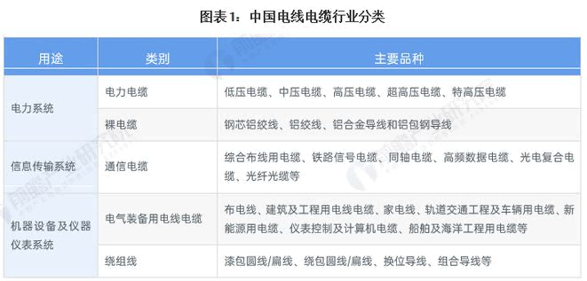 電線電纜產品是電氣化、信息化社會中必要的配套產品,廣泛應用於發電、輸配電及終端用電等電力生產、傳輸及應用的各個環節,與國民經濟的發展及人們日常生活密切相關。電線電纜按照用途劃分可以分為五大類:電力電纜、通信電纜、電氣裝備用電線電纜、裸電線以及繞組線。