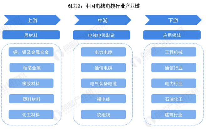 目前,我國電線電纜行業產業鏈較為成熟,上遊行業主要為提供製造電線電纜產品原材料的基礎材料行業以及製造交聯絕緣套及護套料的橡膠行業,如銅、鋁及其合金、聚乙烯、聚氯乙烯化工行業等;中遊包括提供電力電纜、通信電纜、電氣裝備用電纜及裸電線、繞組線等其他類型電纜的電線電纜生產製造企業;下遊主要為對電線電纜有需求的行業,如工程機械、通信行業、電力行業、石油化工及建築行業等。