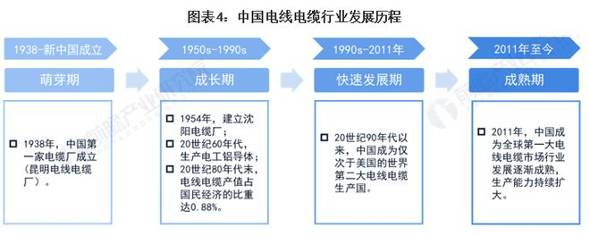 20世紀90年代以來,我國電線電纜業獲得高速發展,中國也是僅次於美國的世界第二大電線電纜生產國。2011年,中國電線電纜產業規模首次超過美國,成為全球電線電纜行業第一大市場。隨後,隨著我國電線電纜市場快速發展,行業已經步入成熟階段。