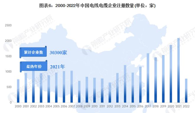 我國電線電纜行業的企業數量眾多,其中以中小企業居多。根據中國企業數據庫企查貓,截至2022年12月27日,中國電線電纜行業的主要企業共有30300家,其中以2021年為主要注冊熱潮,當年注冊企業數量為2095家,而2022年則為778家。