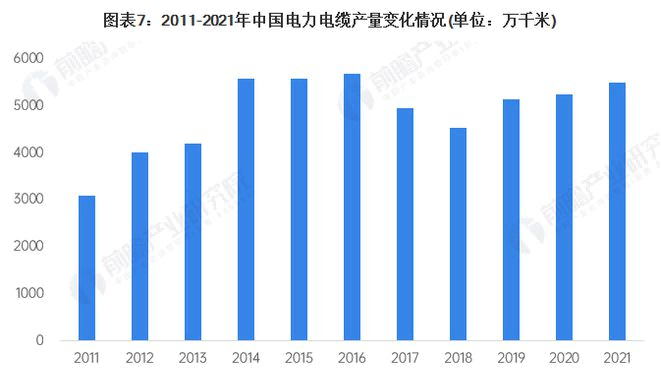 國家統計局數據顯示,2011年以來,我國電力電纜總產量整體呈現震蕩走勢。在經曆2017-2018年連續兩年產量規模下滑之後,2019年,我國電力電纜總產量規模有所回升,整體規模達到5141萬千米,同比增長13.44%。2021年,隨著疫情逐步好轉,國內電力電纜產量達到5480萬千米,同比增長4.52%。