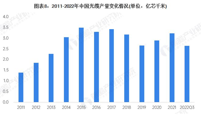 光纜方麵,國家統計局數據顯示,2011-2021年,我國光纜產量整體呈波動變化。2021年下半年以來,尤其是2021年10月以來,中國移動、中國電信等運營商對普通光纜產品等集采招標呈現量價齊升的趨勢,采購規模和價格均較上年實現較大幅度上升。一直到2022年上半年,中國聯通和中國廣電也進行了相關光纜產品的集采。2022年前三季度,國內光纜產量累計值達到2.64億芯千米,光纜產量累計增長11.5%。