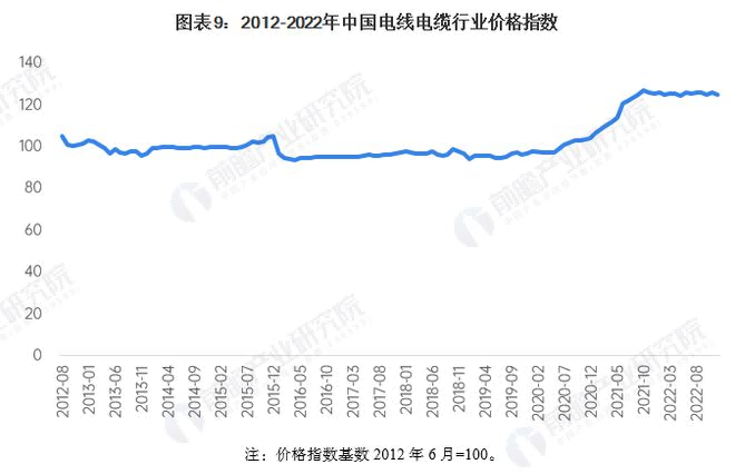 近年來,我國普通電力電纜、光電線纜、通用裝備線纜企業數量較多,產能已經過剩,市場陷入以價格競爭為主的低水平惡性競爭,行業的價格水平自2016年起持續下滑。中國五金機電價格指數顯示,電線電纜行業價格指數長期以來低於100,產品技術含量低、同質化問題嚴重是導致行業價格持續低迷的主要原因。但是隨著疫情影響減弱,市場投資熱情漸起,加之政策的引導,自2020年11月開始,價格指數有了明顯的回升。截至2022年12月,我國電線電纜行業價格指數為124.65,已經遠高於前期高點。