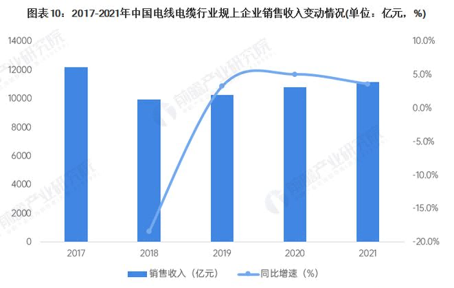 根據國家統計局的數據,由於近年來我國宏觀經濟疲軟和製造業去產能的影響,電線電纜行業一度出現規模下滑,並在2018年達到低穀,達到0.99萬億元。隨著我國對新能源等投資的加快,電線電纜行業開始緩慢複蘇。2021年中國電線電纜行業規上企業銷售收入達1.12萬億元,同比增長3.6%。