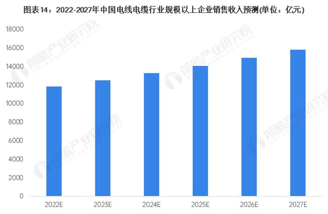 南網電網明確提出,“十四五”期間規劃投資約6700億元,以加快數字電網建設和現代化電網進程,推動以新能源為主體的新型電力係統構建。根據國家對電線電纜主要應用領域-電力(新能源、智慧電網)、軌道交通、航空航天、海洋工程等規劃來看,未來我國電線電纜行業前景向好,行業產品升級趨勢明顯。預計到2027年,中國電線電纜行業規上企業銷售收入接近1.6萬億元。