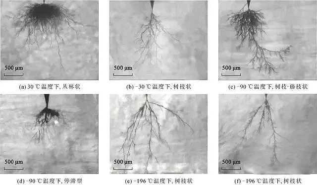 在實驗過程中發現了4種形狀的典型樹,分別為叢林狀、樹枝狀、停滯型和樹枝−藤枝狀。電樹枝的形狀隨著溫度變化而變化。